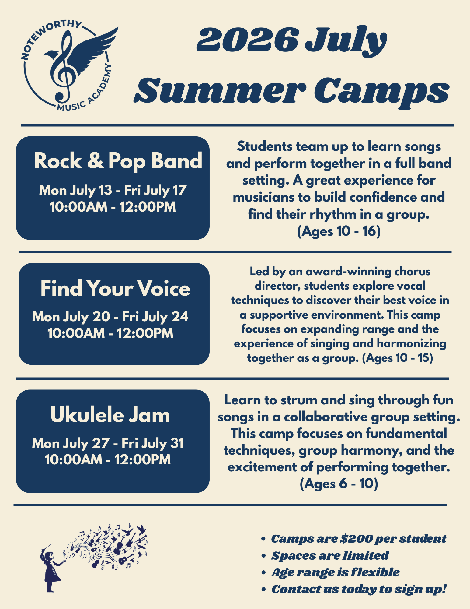 Join us for a summer of hands-on music making! Our 2026 Summer Camps are designed for students of all skill levels to explore new instruments, build confidence, and collaborate with others.